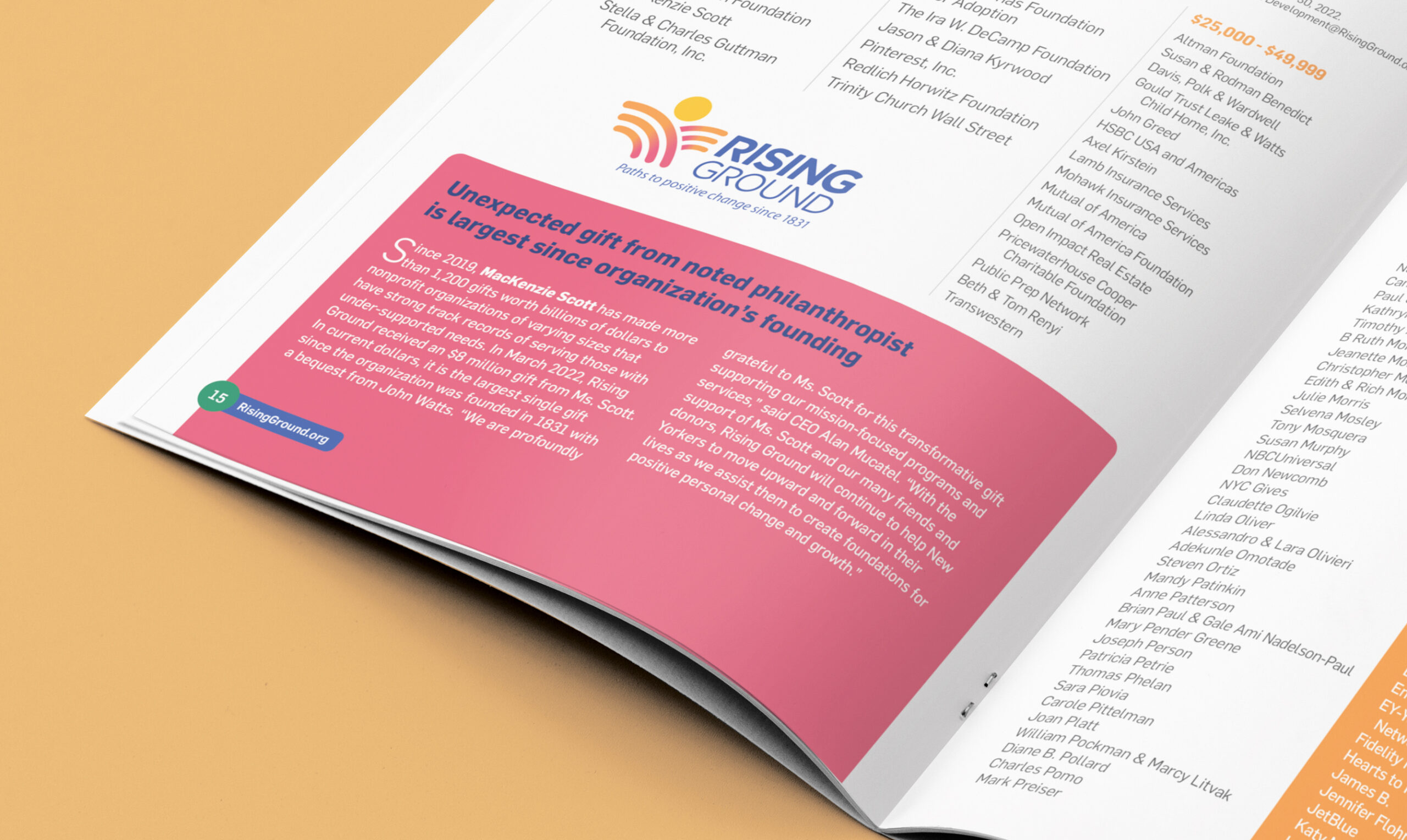 Rising Ground is a leading nonprofit human services organization that provides children, adults, and families in the greater New York City area with the resources and skills needed to help them rise above adversity and positively direct their lives. Originally founded as the Leake & Watts Orphan House, 2021 was the 190th anniversary of Rising Ground.